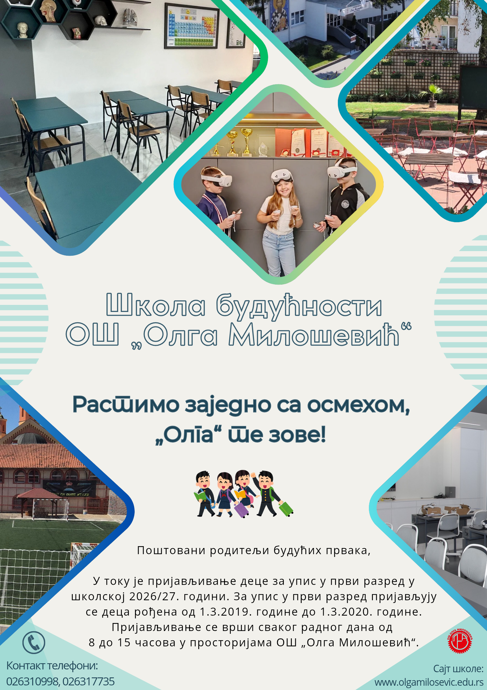 У току је пријављивање деце за упис у први разред у школској 2026/27. години. За упис у први разред пријављују се деца рођена од 1.3.2019. године до 1.3.2020. године. Пријављивање се врши сваког радног дана од 8 до 15 часова у просторијама ОШ „Олга Милошевић“.